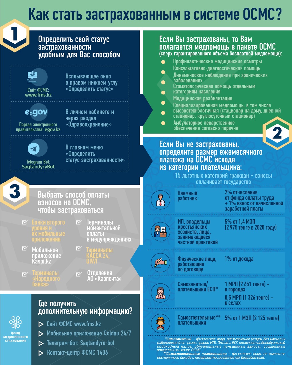 Мобильное приложение Qoldau 24/7. Для этого в меню необходимо выбрать раздел «Проверить статус застрахованности», далее – ввести ИИН. В окне появится статус и информация о наличии платежей за предшествующие 12 месяцев.